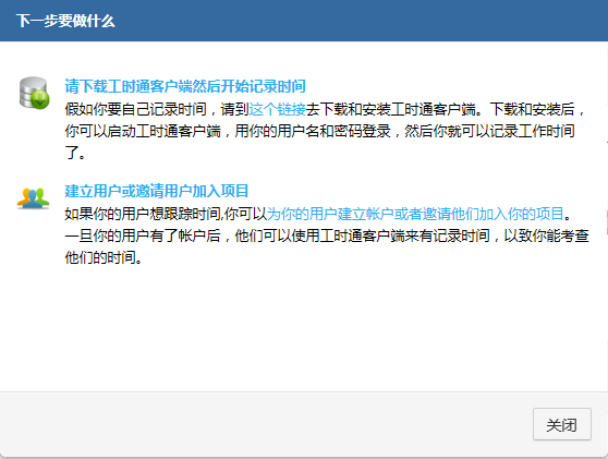 如果是你自己要记录时间,请从「下一步要做什么」的页面或者主页的「下载」页面下载、安装工时通客户端。下载和安装后,你就可以启动工时通客户端,用你的用户名和密码登录,然后你就可以记录工作时间了(如果你的项目下面没有创建任务,客户端会使用默认任务)。当客户端运行一段时间之后,你就可以在网站的「时间浏览」里查看你的时间记录了。
